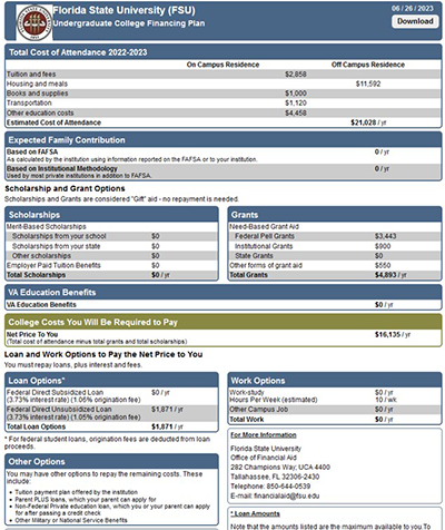 If you are enrolled at FSU, the College Financing Plan Sheet (also known as the Shopping Sheet) provides an individualized look at the costs for the school year. The sheet includes the total cost of attendance, expected family contributions, loan options, and any scholarship, grants, or VA education benefits the student may have.